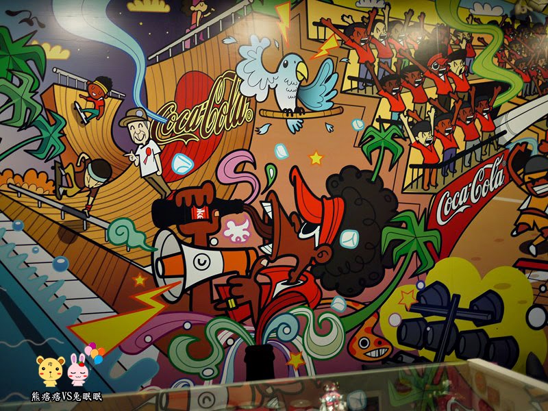 進入商店時,會先被櫃檯的大壁畫給吸引住,裡面的構圖是以運動題材結合可口可樂來設計的,繽紛喜氣的插畫,給人一種滿滿活力的感覺。