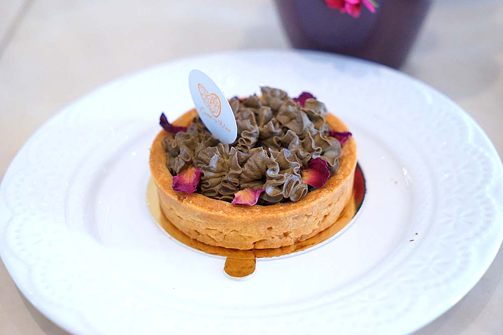 三盆糖布蕾塔來囉!大多數以前吃到的烤布蕾都是裝在器具中的,不過這個是現點現裝現烤,直接裝在塔皮中。