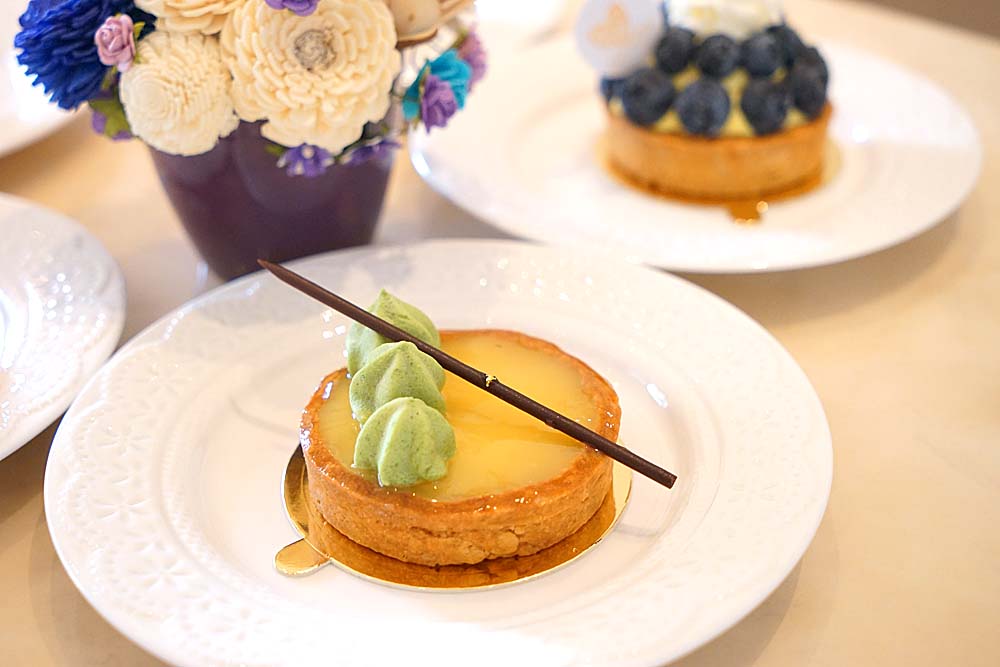 這是日和柚香塔,這款甜點是用日本柚子非台灣的,上面的是抹茶棉花糖,第一口吃到內餡時,眼淚都快飆出來了,歪腰!好酸!老實說對我來講酸度有點高,但在吃第二口的時候,那種酸度降低了,取而代之的是花果清香的滋味,酸甜酸甜的。