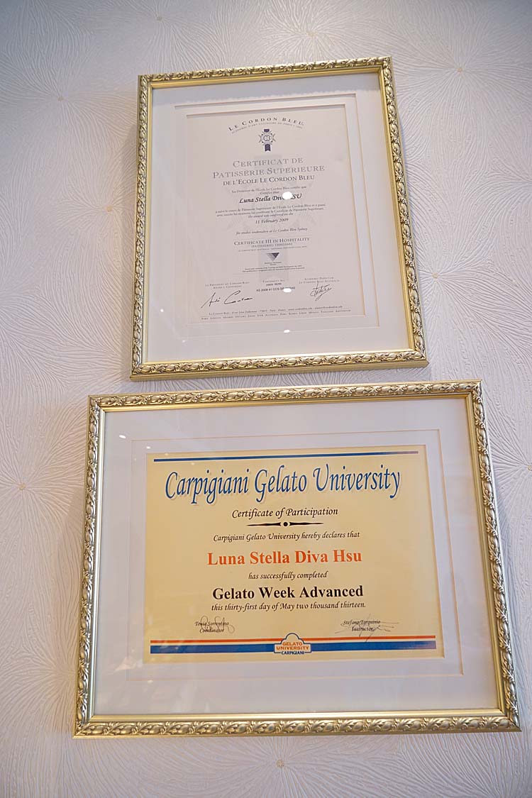 牆壁上放著法國藍帶廚藝學校和義大利冰淇淋大學的畢業證書.,代表著為了夢想努力的象徵與甜蜜果實。