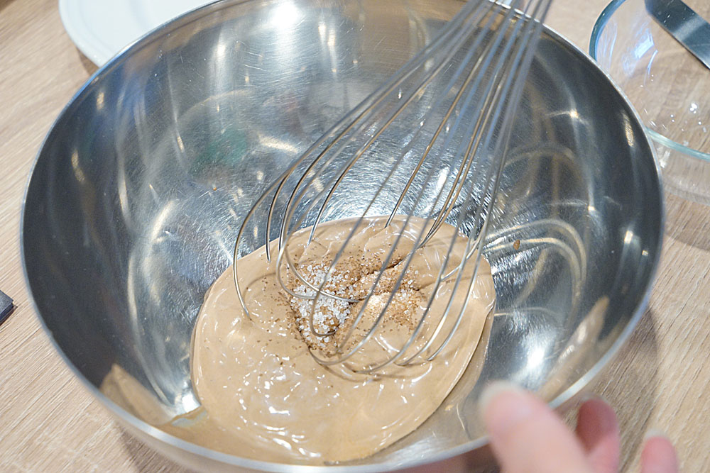 這次要處理的是巧克力的部分,需要加上糖持續攪拌,而這次真的需要比較久的時間,要讓他整個變得比較黏稠。