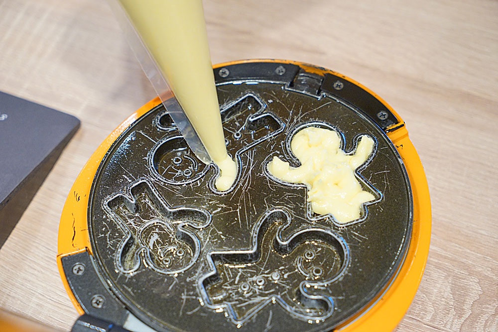 一開始以為擠麵糊最簡單,沒想到這是所有過程中覺得最困難的啊!要完美的把麵糊放在鬆餅的手腳上還是需要一點技術的啦!