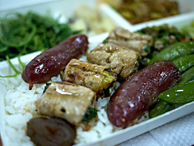 蔥香豬肉捲飯,配菜的部份很豐富,味道也還不錯,但整體菜色偏油,可能是因為烤肉的關係吧?香腸的部份因為有淋到烤肉的醬汁,吃起來的味道比一般外面賣的還要濃郁。