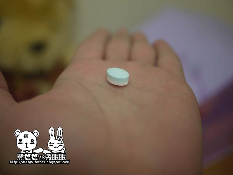 一錠的顏色分為淺藍與白,吃的時候其實用含的就可以了,一開始熊痞痞把它當成口香咬…結果太刺激!整個人都清醒起來了~~口味上有點微甜,比較建議。。。真的。。。要用含的!
