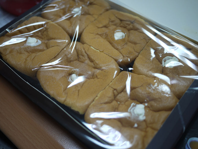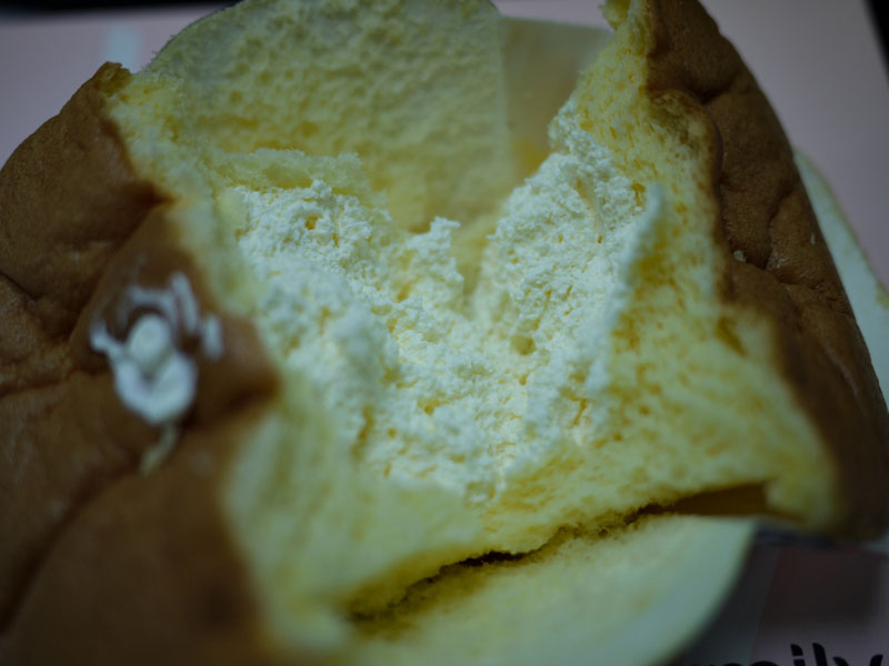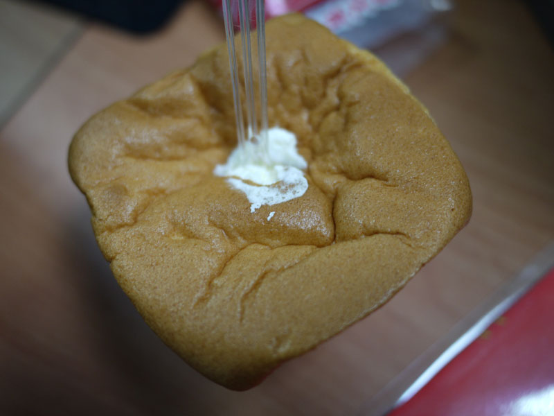 然後一開始我們呆呆的,沒有注意到有湯匙,因為是第一次吃到這種東西,所以熊跟同事就用手把他撥開來吃,裡面的內餡如上圖,奶油看起來不是很多的那種。