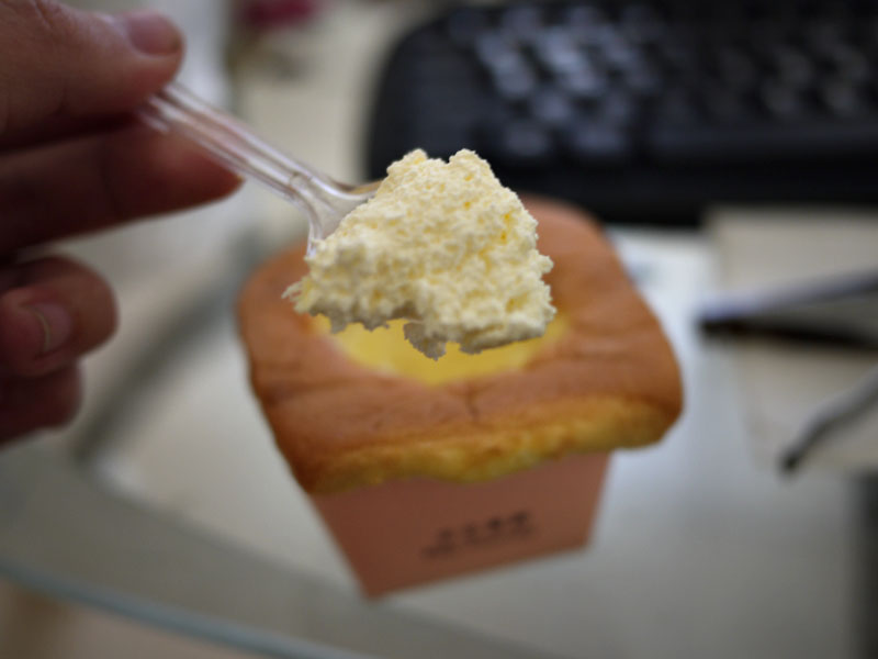 等到第二個人在拿起杯子時,我們才發現到裡面有附贈湯匙,立刻重新拿起相機拍照,原來真正的吃法是用湯匙下去挖的,難怪上面都會有一點白白的地方!