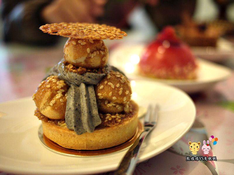 上面是略硬略脆的餅乾,往下咬到的第一顆小泡芙,帶點酸酸的清爽滋味,夾帶著桂冠湯圓的芝麻香,不過我很好奇他的底座到底要怎吃?因為我都是用挖著吃…挖到最後就剩下底層的空殼,有點太硬吃不下….層次跳脫的很妙….