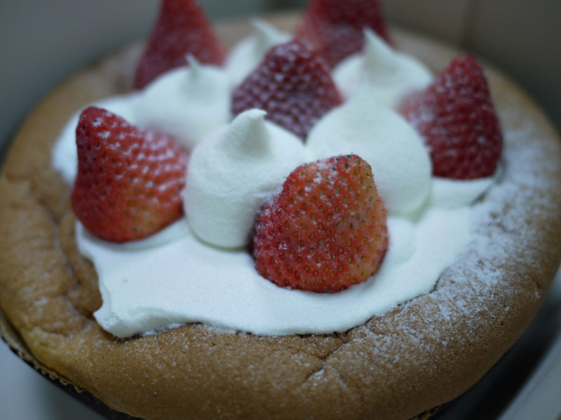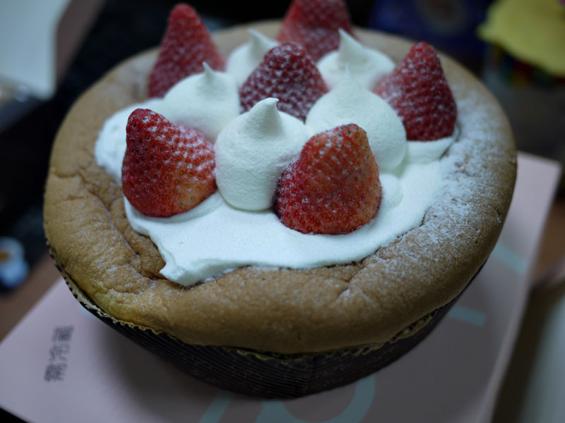 上層的鮮奶油,牛奶味很濃,但吃起來沒有很甜,搭配微酸的草莓剛剛好,我想這是不用甜草莓的關係吧!至於蛋糕體的部分,跟牛奶戚風的一樣蓬鬆,可是吃起來,卻有比牛奶戚風好吃的感覺,個人是偏愛草莓大戚風的蛋糕體。