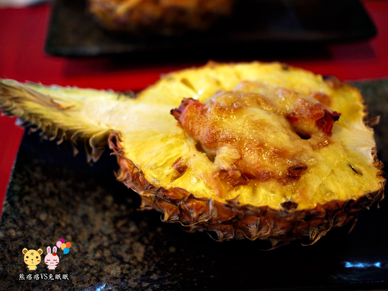 第四道是鳳梨焗海鮮,將鳳梨先挖一個洞後,在把蝦子等主料放在鳳梨中焗烤。