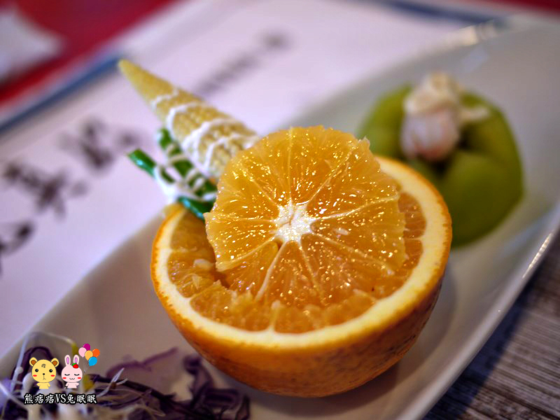 今天的第二道菜是水果沙拉,有柳橙跟奇異果,透過生菜的裝飾,營造出一種小巧可愛的感覺。