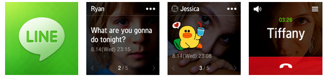 LINE Galaxy Gear 版本支援免費通話、文字通訊、貼圖發送等功能。無需另外付費,即可透過這個智慧型裝置撥打語音電話、瀏覽歷史訊息,而有新訊息或來電時,用戶也會即時收到通知。