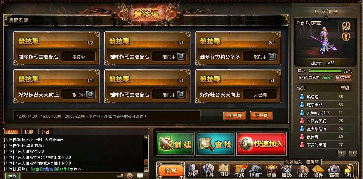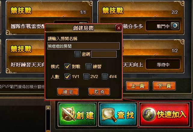 好啦,回到正題,這款遊戲的競技場,除了1V1對戰外,還可以用組隊模式,4V4只有特殊任務出現時才會有人想參加,因為平常4v4並沒有列入排行榜,也無排名獎勵。