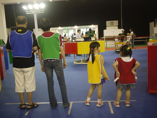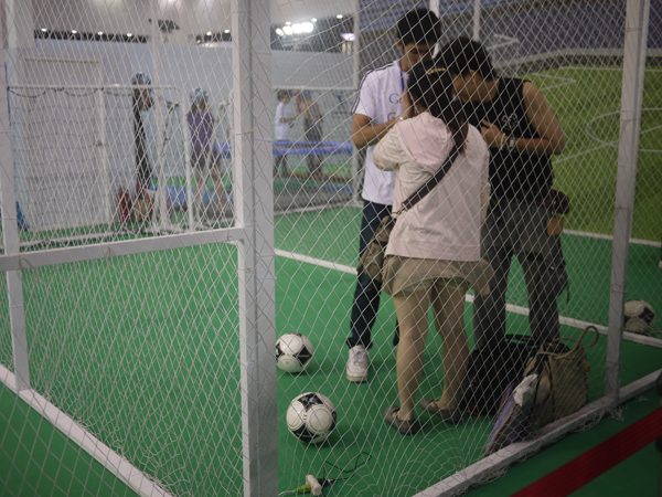 一進入會場,熊第一關就跑去挑戰鐵人三項,他們的鐵人三項是採用四人一組的競賽模式,最左邊排隊的白衣服咩咩,是跟熊一起參賽的人,不知道他們會看到這篇文章嗎?呵呵XD。