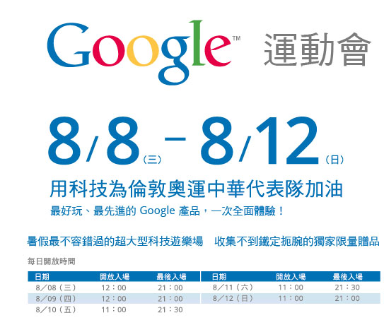 什麼!什麼!全球首創的Google運動會,即將於明日在台北偷偷開跑囉!此時此刻,若您還待在電視前看倫敦奧運轉播~那也太遜了吧!走過看過,絕對不能錯過!最精彩、最好玩的Google產品,通通都在台北市信義區A13的停車場 (Neo19的正對面),讓我們一起用科技為倫敦奧運中華代表隊加油,一起用熱情擠爆現場吧!