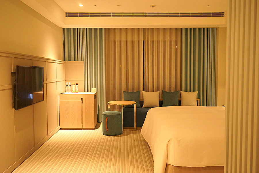 介紹完靠近門的地方後,現在來帶大家觀看房間內的視野吧!基本的床還有搭配沙發,有桌子可以小小辦公,但若能再多一張會更棒,剛好我們兩個都會帶筆電,這方面需求就會特別注意。