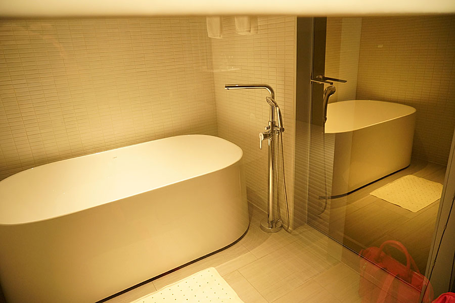 對面的淋浴跟泡澡的是設計再一起,沖澡的兩邊都可以,我覺得最扯的是,門的後面超乾淨的,就像是一面鏡子,你有看到浴缸的反射吧?不誇張,可以邊洗澡邊欣賞自己的概念(笑)。