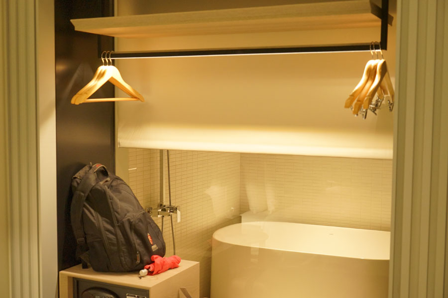 浴缸外面的玻璃雖然是透明的,可以享受浪漫的兩人世界,也有窗簾可以保有隱私避免春光外露,比較特別的設計是,衣櫥也算是開放式的。