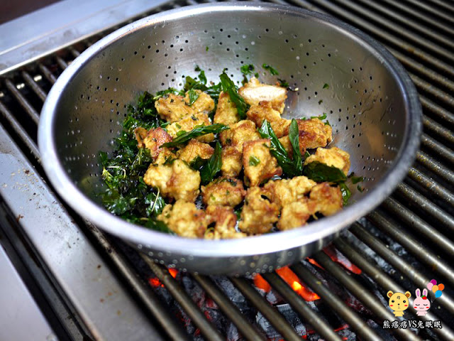 默默的,老闆等油瀝乾後,就把炸雞裝在另一個有洞的器具上,並在炭火中進行烤的動作!
