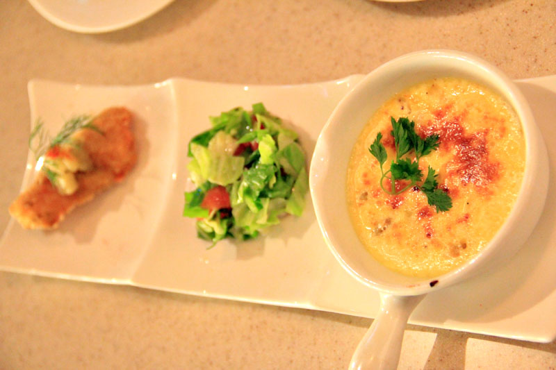 湯品的是馬鈴薯鮪魚奶油湯,偏鹹,鮪魚的部分應該是用鮪魚罐頭,有大塊的馬鈴薯塊,還不錯喝,但因為偏鹹又有很重的鮪魚味,所以後來沒喝完。(兔兔本身是清淡口味)