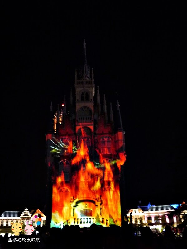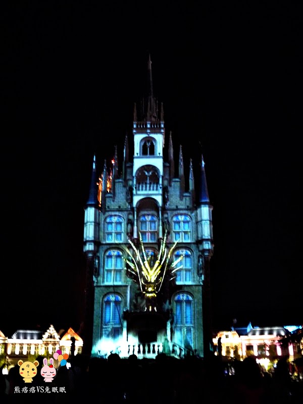 一陣七彩的光芒從窗內映出,整座城堡順間染上五顏六色的裝扮,慢慢的又像被切豆腐似的劃開。