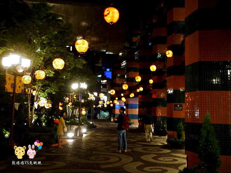 週邊的街道上,藏匿了不少南瓜人的蹤跡,瞧瞧有一對情侶正在與南瓜人拍照呢,而他們頭上的燈籠,也都有南瓜臉造型的唷!說真的,我還蠻喜歡凌晨時,沒有過多的遊客,一個人走在這樣的街道上,靜靜的漫步,腦中的思緒也會特別清晰呢,這次的萬聖節裝置,算是額外的驚喜吧?