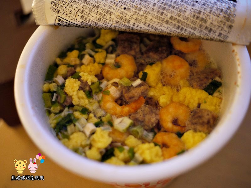 小時候吃到台灣的杯麵,裡面都有跟它差不多的料啊!要蝦有蝦,要肉塊有肉塊,現在卻像是被多啦a夢放了縮小燈似的,肉塊也跟肉渣差不多了….