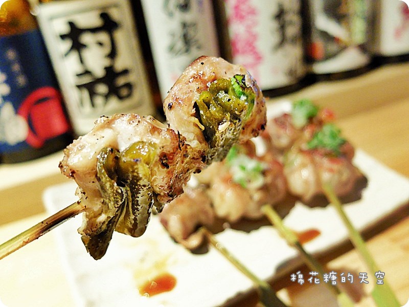 接著上桌的一開始我還以為是一般的雞肉串~沒想到竟然是剝皮辣椒燒鳥串(100元/2串),雞腿肉裡夾進了台灣在地的剝皮辣椒,腿肉烤的剛剛好~還保有濕潤的口感,裡面的剝皮辣椒沒有明顯辣味~但是卻有獨特的甜味,風味很不錯唷!