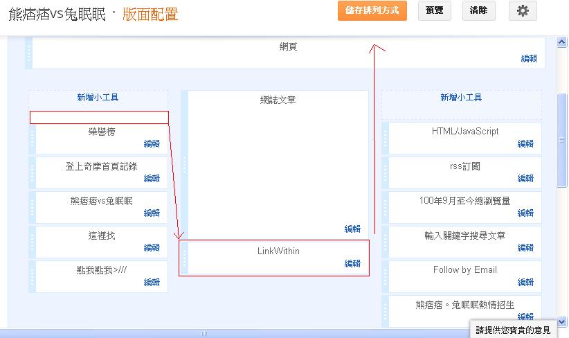 第四歩:將【LinkWithin】的模組搬移到網誌文章下方,再按下儲存排列方式。