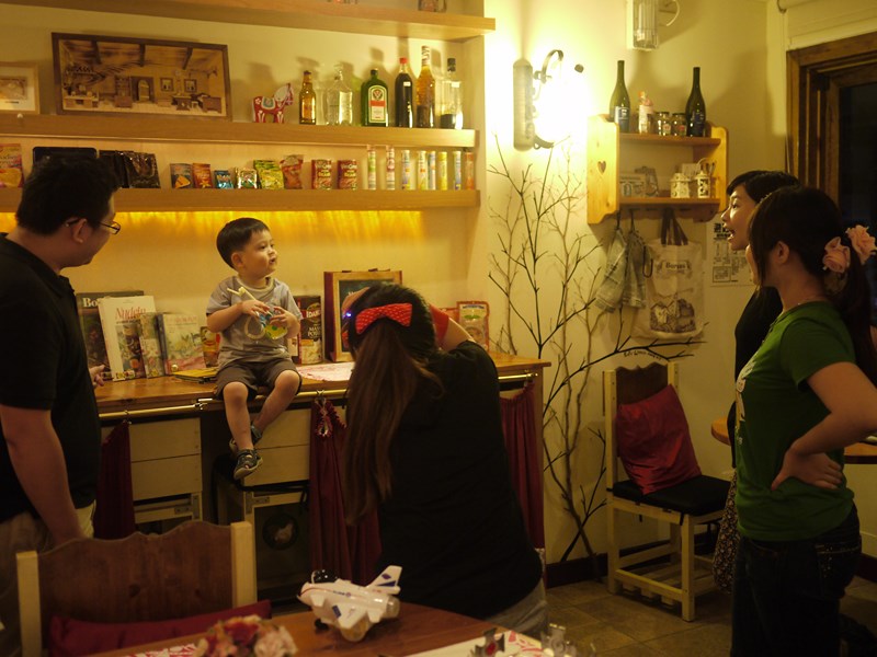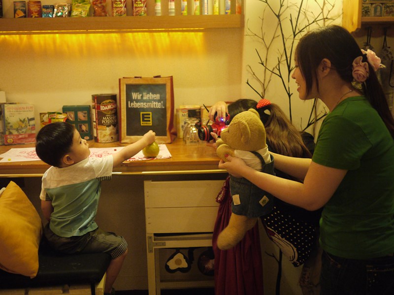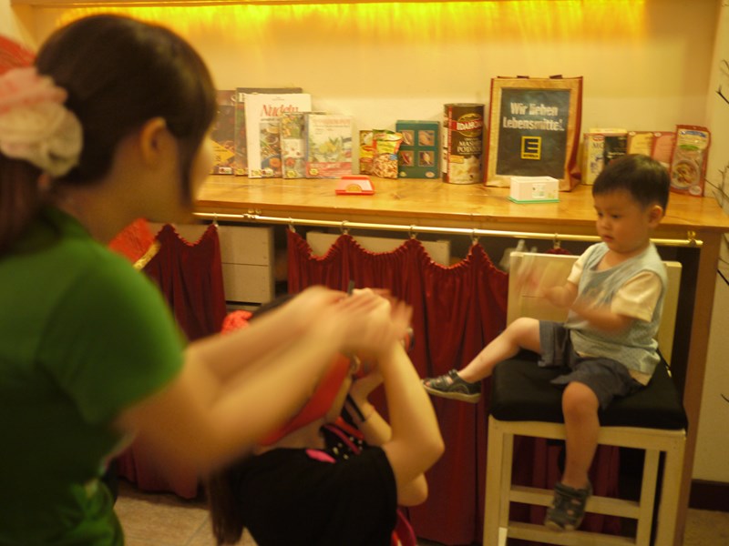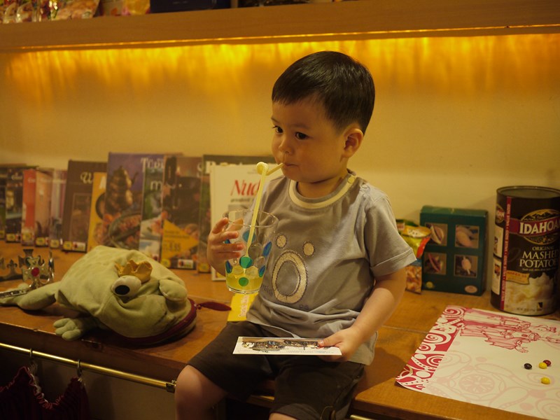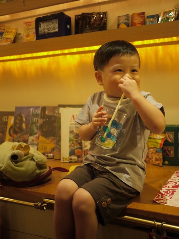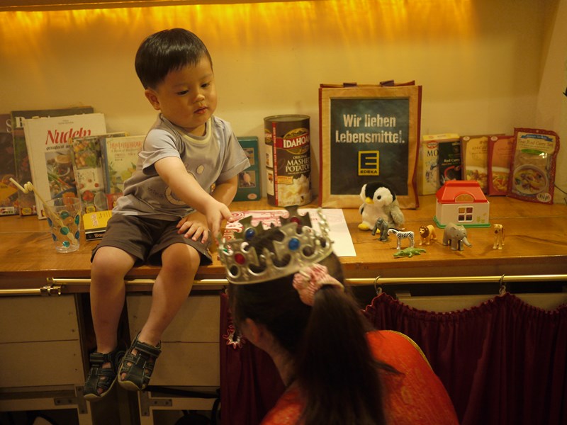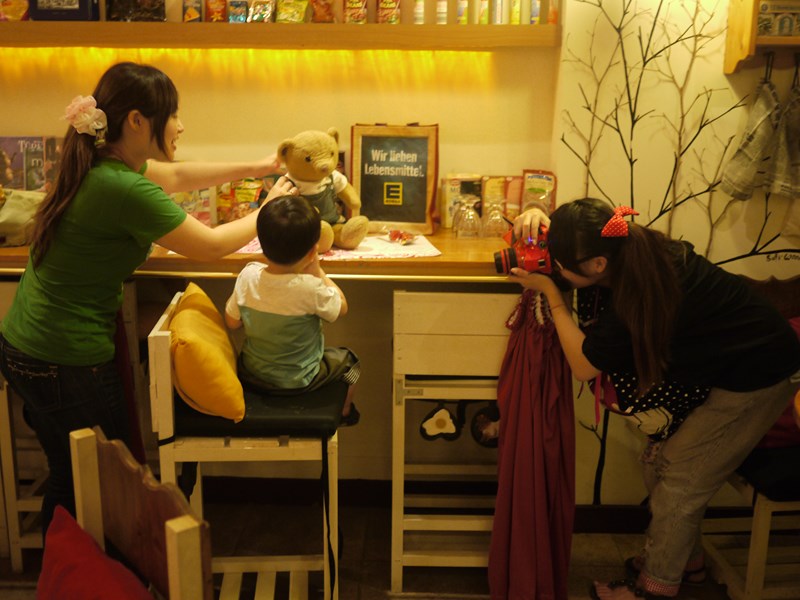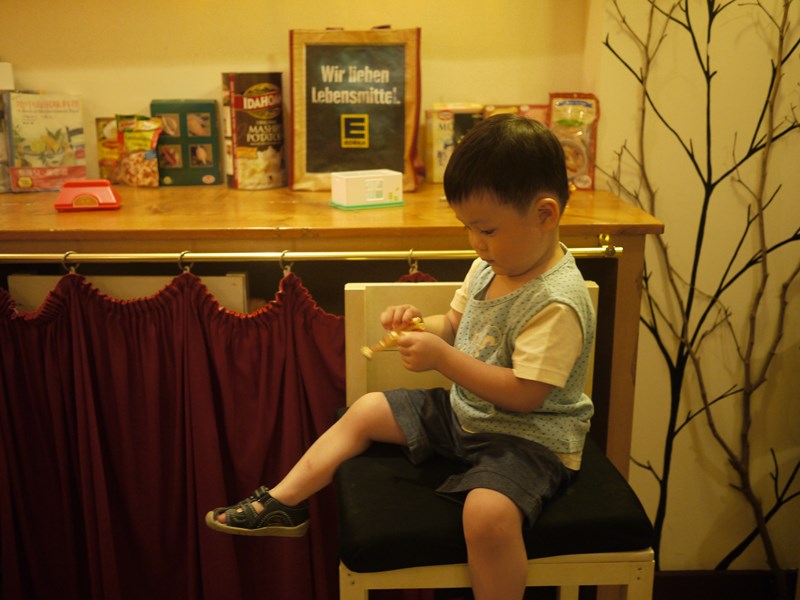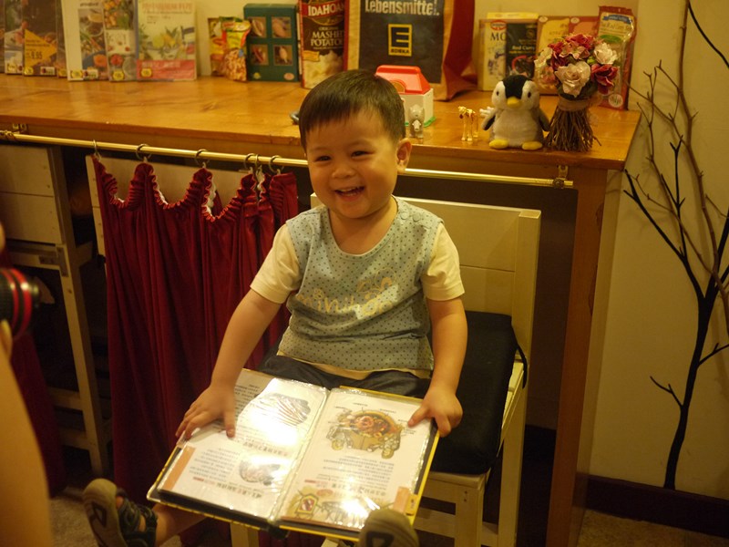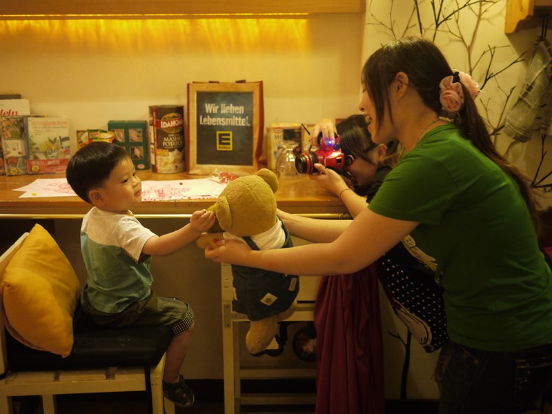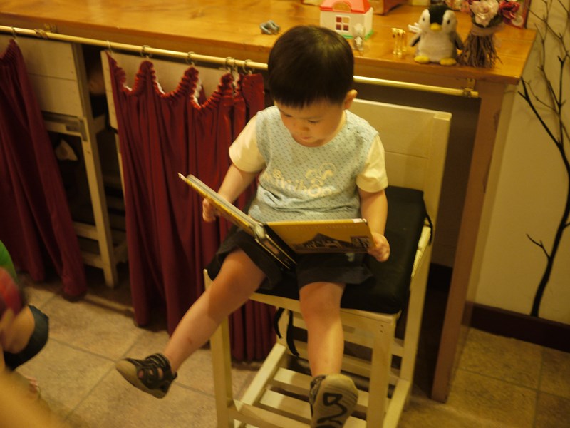 在大家的誘惑下,棒棒終於換了一個位置,玩起了他的長頸鹿。