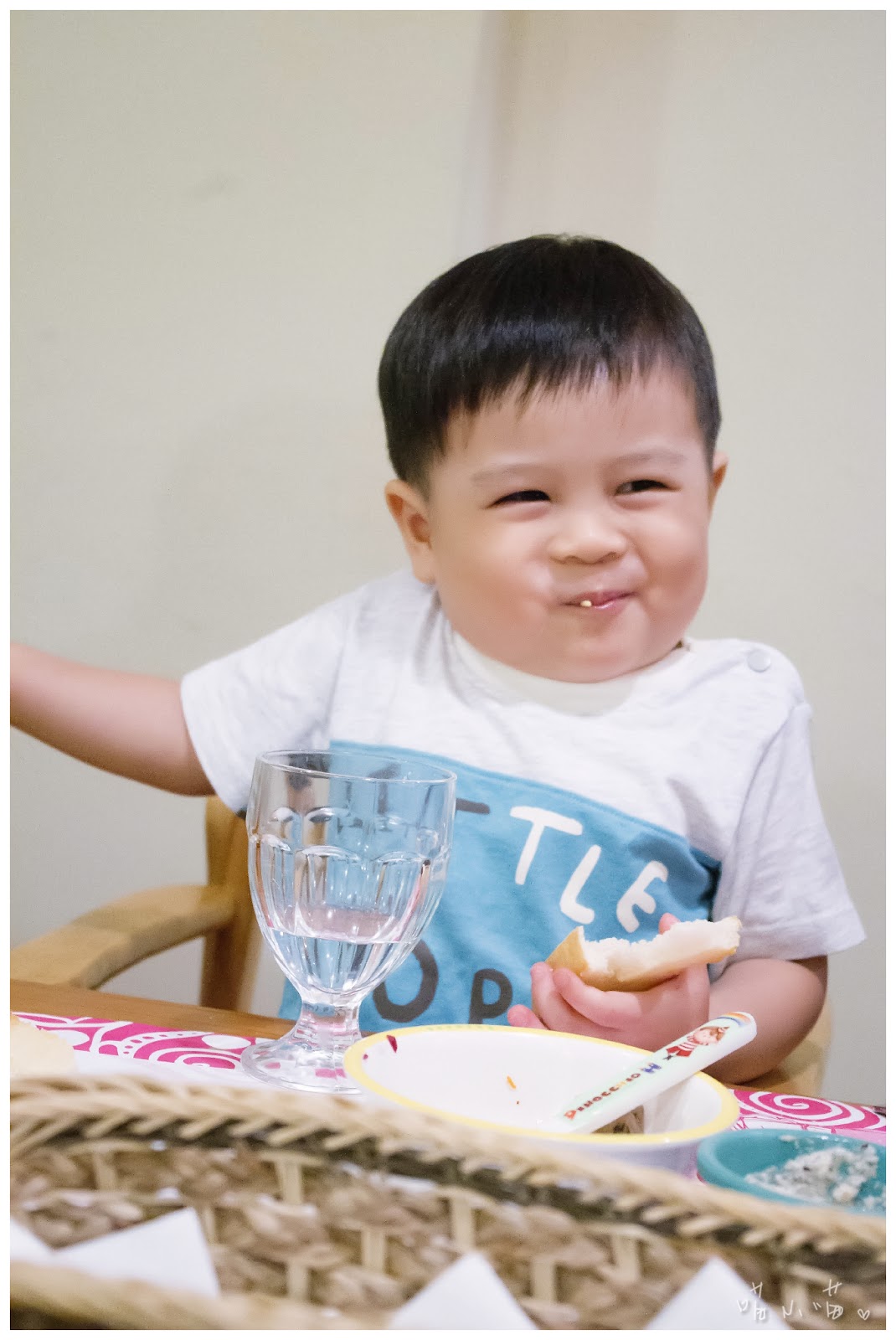 棒棒:「哎唷~人家是為了陪媽咪吃燭光晚餐耶,而且棒棒很聰明唷!剛剛還換了英文字的衣服,現在可是博學多文的小大人,哇!德國秘密旅行的晚餐看起來都好好吃。」