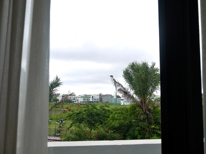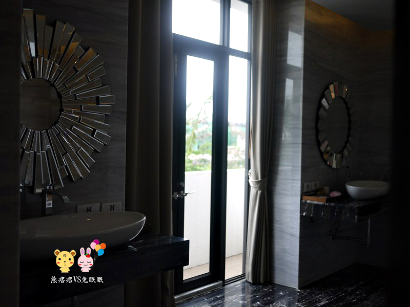 猜猜看這是什麼地方?竟然有兩個洗手台與鏡子耶,空間很大,中間還有陽台可以出去,最酷的是,拍照的右手方就是洗澡的浴缸,也就是說…其實你在裡面洗泡澡,還可以看到以下的情景。