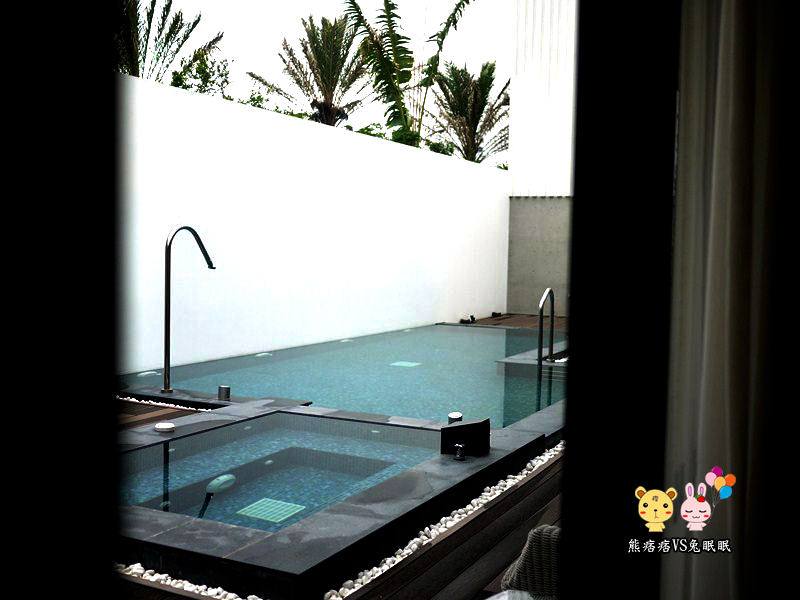 嗯…這也太開放了吧!洗個澡也要這麼享受就是了,如果害怕可能會曝光的人,只需要把窗簾都拉起來就可以了,但說真的,整體逛下來的感覺,這邊的空間很大,露天的游泳池真的很吸引人,加上這個地方比較偏遠些,感覺就是專門為….所設的,哈!有興趣的朋友可以自己參考看看,我沒實際住過,單純參加活動順便拍的,住起來好不好就要靠自己去體驗了。