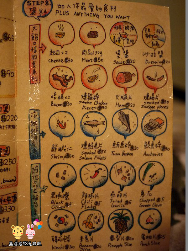 配料的部分則有加上培根、鮮蝦仁、辣椒片、煎蒜片、鳳梨片、香蕉片等等,全部加一加約460元。
