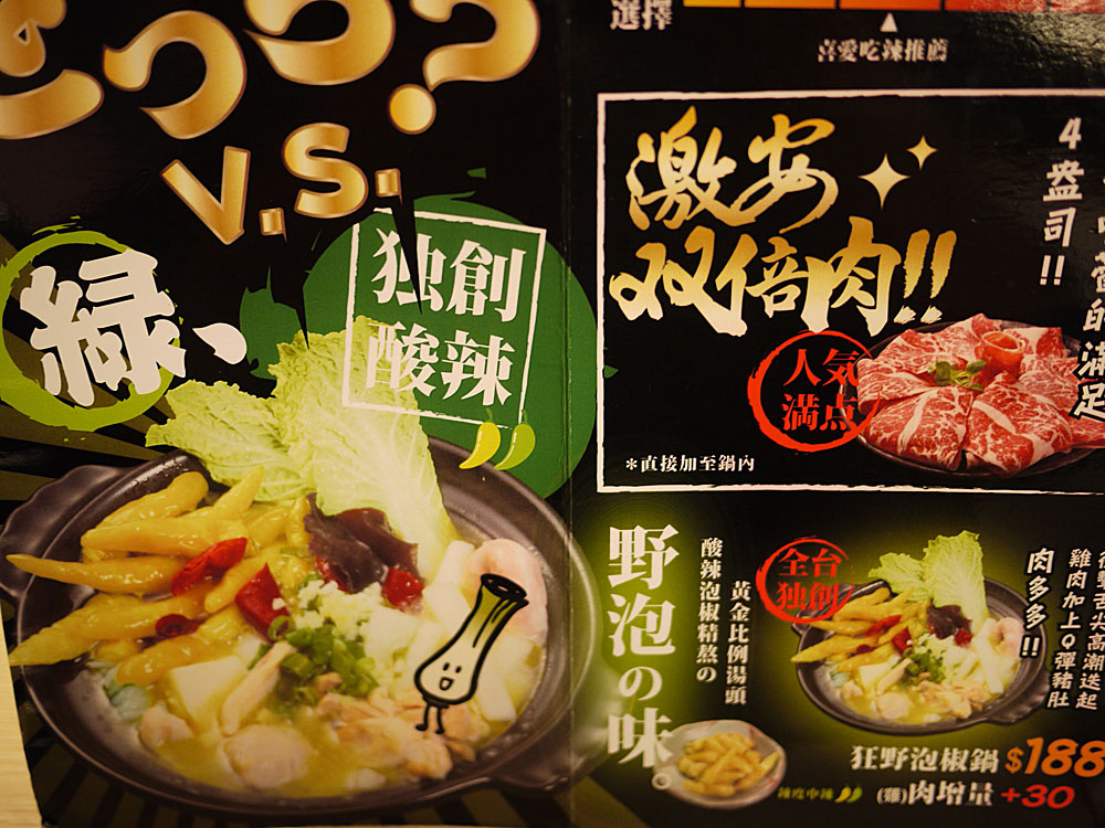 今天的主角則是狂野泡椒鍋,裡面的用料比較沒有其他鍋那麼豐富,但訴求的是那獨創的泡椒口味,另外還可以加100元升級為套餐組合,我還蠻喜歡他們家的炸雞,可是東海店的沒賣這款,兩家店的東西似乎有些不同。
