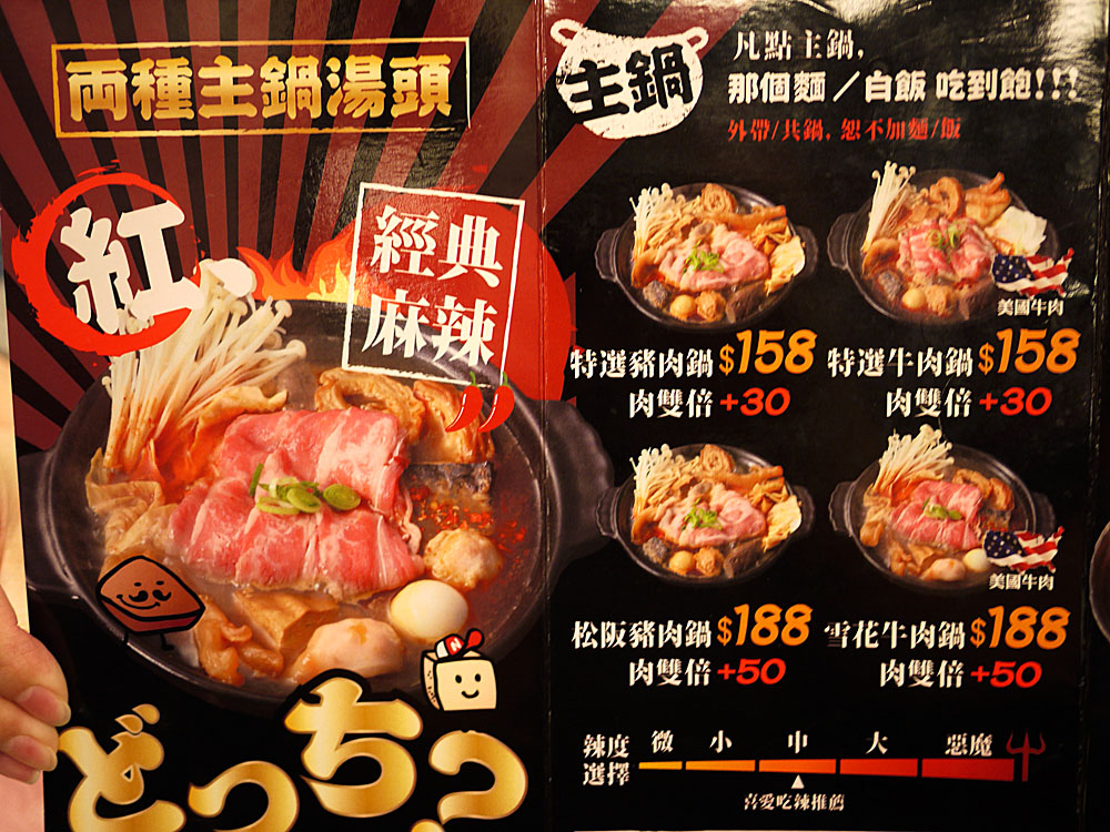 價位在158~188之間,不同的鍋若要加雙倍的肉則是加價30~50元。