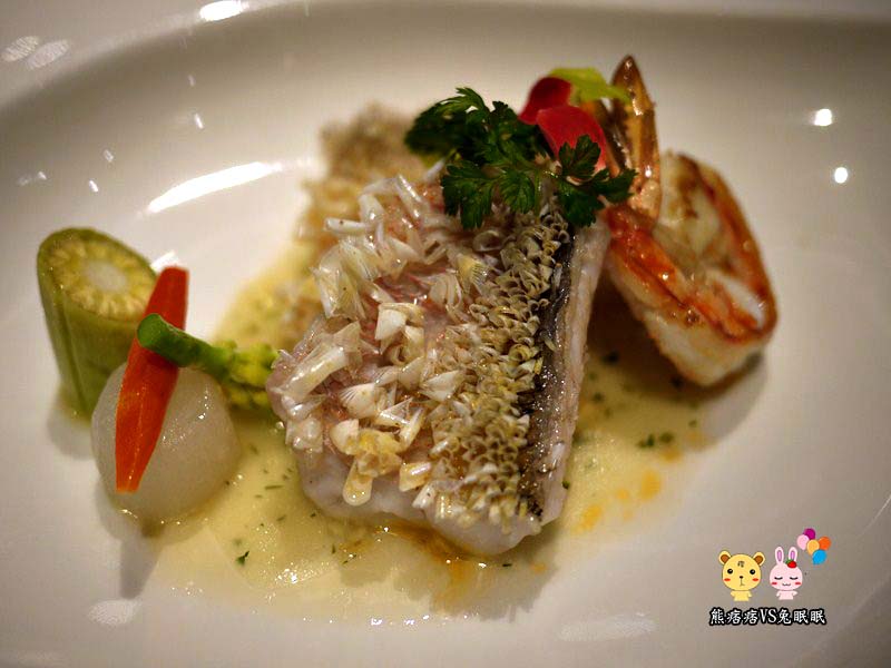 這是香煎馬頭魚及海大蝦配春蔬佐嫩筍醬汁,這道菜主要是吃魚的鮮甜與味,不過一開始看到這滿滿的魚鱗,有讓我嚇到…..