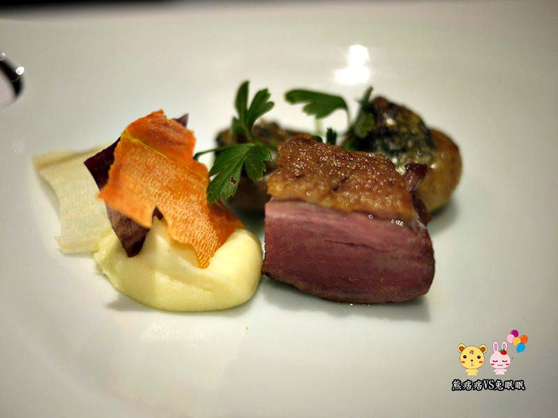 這是秋實套餐的法式烤田螺搭香草野菇襯宜蘭櫻桃鴨胸及紅酒醬汁,田螺搭香草野菇的部分我覺得蠻普通的,田螺味其實吃不太出來,但鴨肉卻很驚艷,聞起來香,吃起來嫩,不是肉質紮實的那種喔!沾點洋芋泥一起吃又能帶出一些甜味,不會很奇怪。