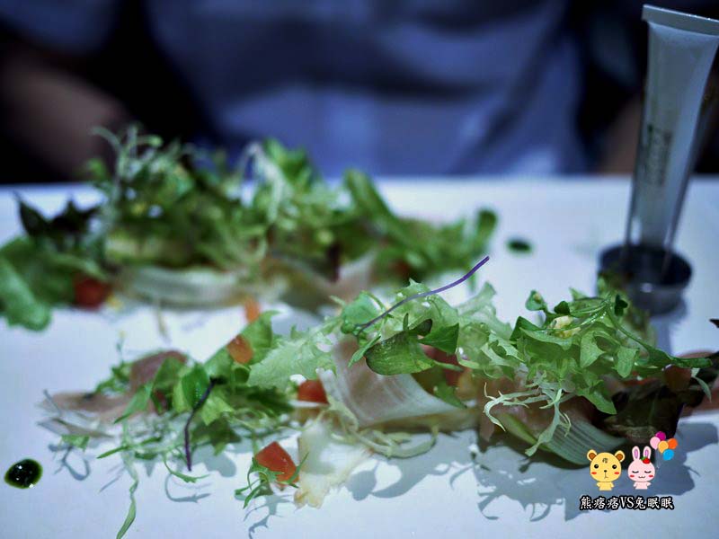 這是另外一個人點的沙拉,是鮮嫩生食特級白蘆筍搭伊比利火腿,是新品菜色!我有偷吃一小塊切成薄片的白蘆筍,很甜,其他的我就沒吃到。