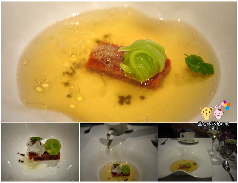 這是巴黎套餐的燕窩和風鴨肉清湯,上菜時是左下角那張圖,可以清楚看到有燕窩、西芹義大利麵與鴨肉等食材,之後服務人員就會端上熱騰騰的湯從旁邊緩緩淋上去,這個湯頭雖然喝起來很清爽,但味道香氣足夠,女生應該會喜歡的!