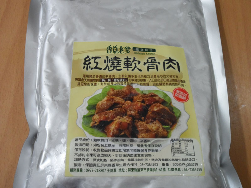 料理本身是冷凍急送,用鋁箔包包裝著,若是沒有要馬上吃就必須要讓它繼續冷凍,因為老爹秉持著「簡單、自然、健康」這三個原則,軟骨肉是沒有加防腐劑的,商品的保存期限是90天(冷凍狀態下)。