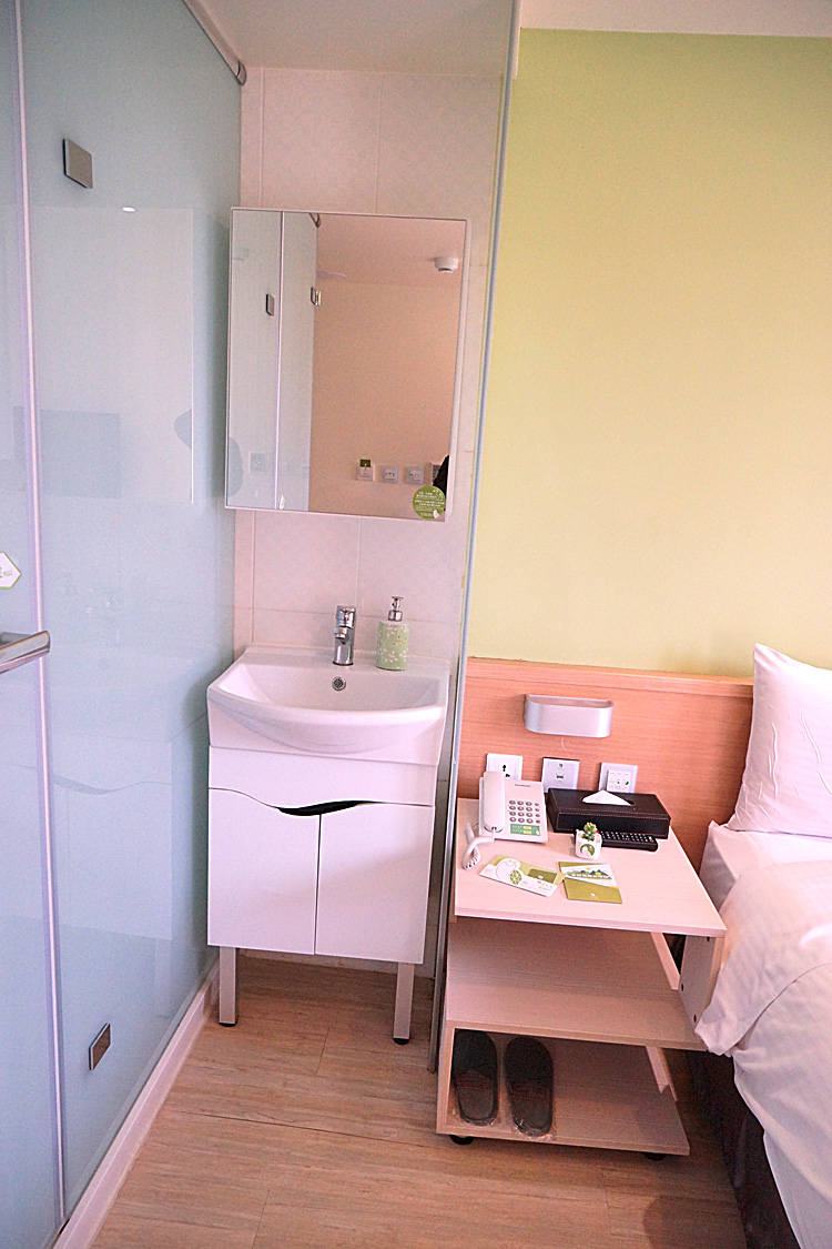 瞧瞧!眼前的空間真的就這樣而已,洗手台是在浴室外面的,疑?牙膏組與一些盥洗的東西呢?還有吹風機呢?