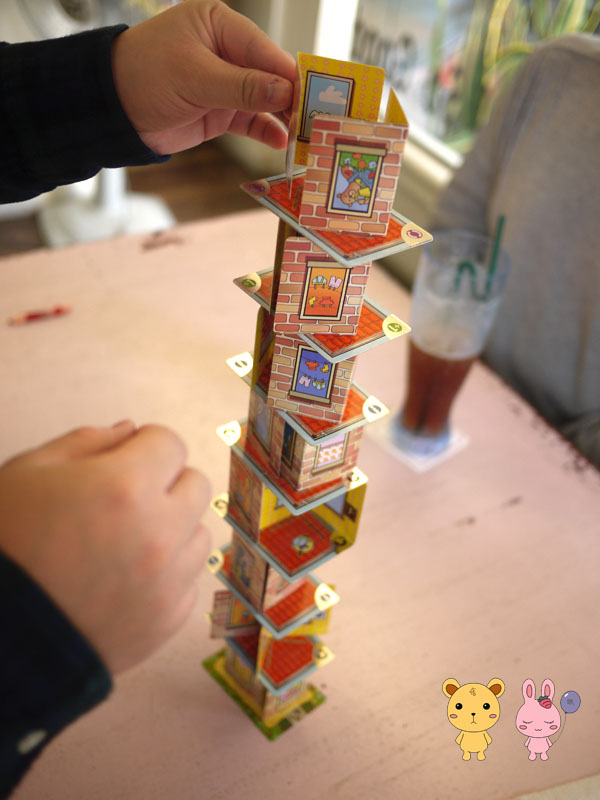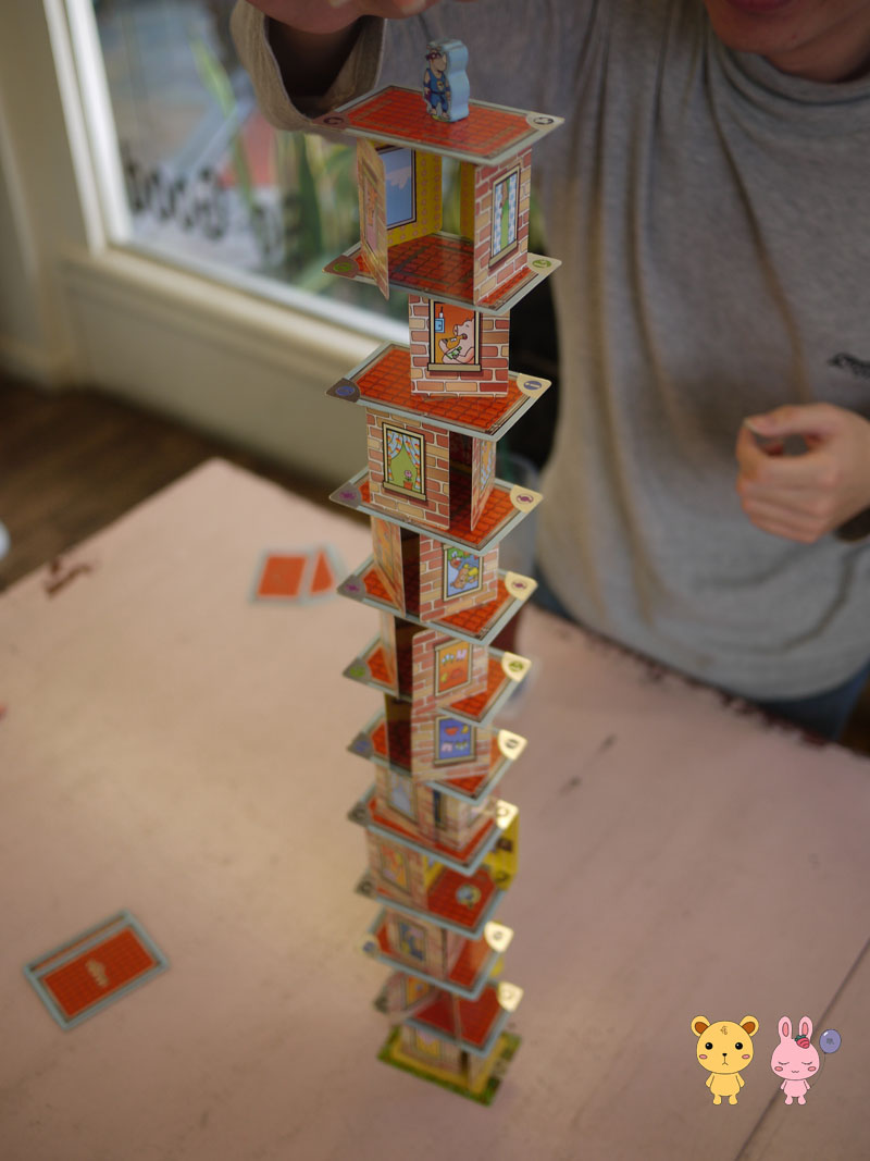 這款遊戲蠻好上手的,一開始檯面上只有一張地基,看到地基上面的兩個方向了嗎?接下來的卡片,就必須依紙排上的方向來蓋,等到全部的手牌都蓋完後,遊戲就結束了,當然過程中如果有人先讓房子倒下,遊戲也直接結束。