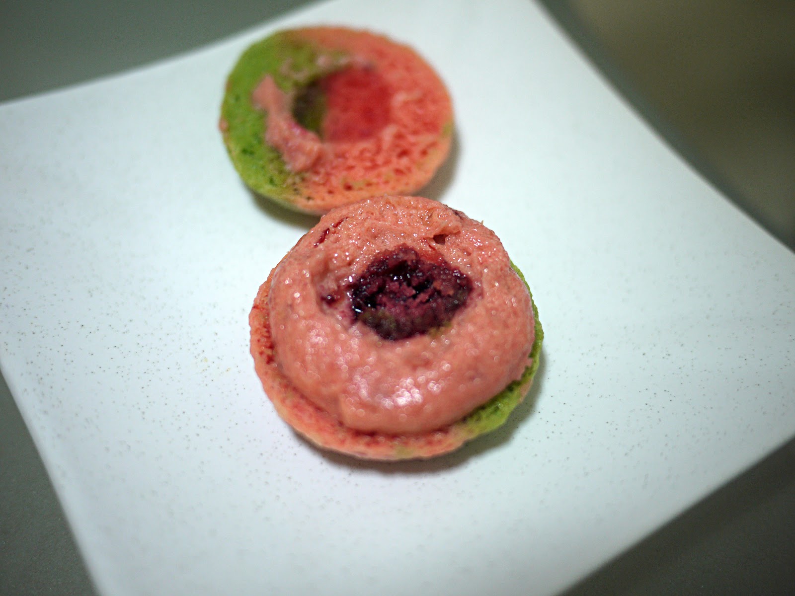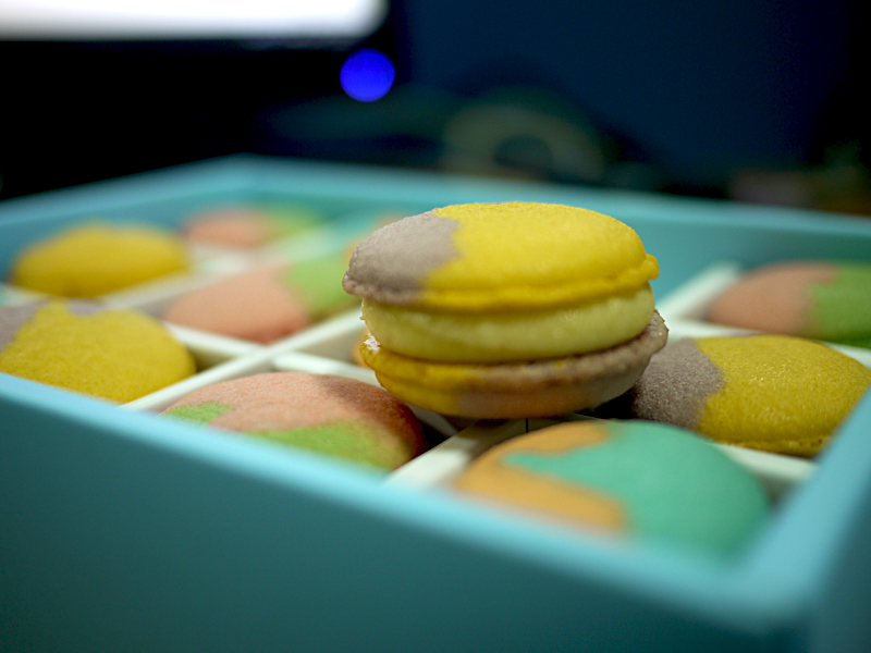 但實際上,如果是從冷凍庫拿出來的,內餡的部分就會比較乾,不會像這張圖一樣,看起來內餡有滋潤度!吃起來的口感則如同卡馬龍的繽紛色彩,讓人有種多層次的味蕾饗宴,而且一開始開箱時,馬卡龍所散撥出來的味道超香的!我想女生不論是看到聞到!!!都會瘋狂的尖叫吧!