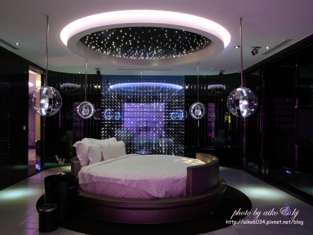臥床區,跟馬克之party house一樣,都是圓床! 但用了很多光纖燈,營造科技感很成功!