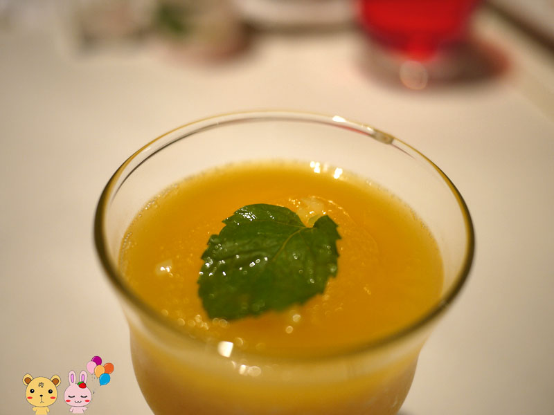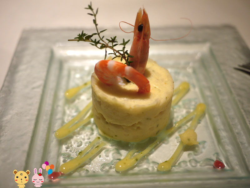 第一道開胃菜選了開胃雙重奏,前方的果凍是用紅酒及萊姆汁製成的,吃的時候要先從起司開始吃,酒位濃,但我覺得這果凍沒啥特別之處,他後方的蘿美心搭配煙燻鮭魚塔塔醬,吃起來很有層次,醬的口感偏酸,配上清脆的蘿美心,有種酸中帶甜的感覺。