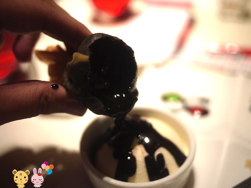 這是甜點巧克力袋冰淇淋,吃的時候要先把巧克力袋弄破,在淋在冰淇淋上,有種冷熱交叉的感覺,蠻特別的。