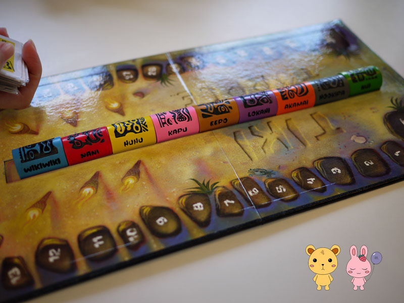 解決行動卡後,我們就要把提基都放到部落之中,進行廝殺動作,提基的位置是有順序的,要按背後的圖案分作3組(貝殼、海星、魚骨)排,之後再依順時針進行遊戲。