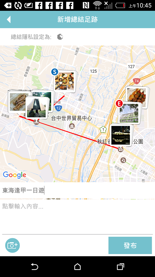 你可以針對本次由成紀錄命名,例如東海逢甲一日遊,再按下發布即完成囉。