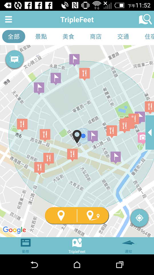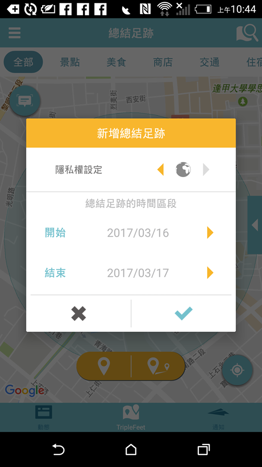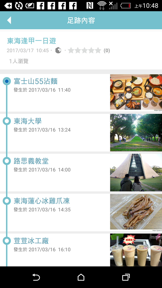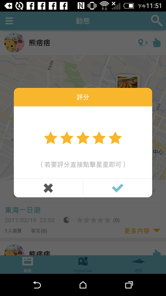 像是剛剛我搜尋的是東海大學,他就可以明確的帶到東海大學據點,之後輸入本次的心得感想,完成後就是一個打卡點,也可以同步分享到facebook,其實蠻簡單的。