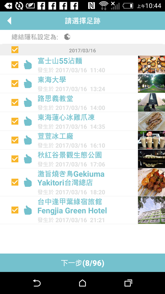 一整天的遊程紀錄打卡點都完成後,也可以針對一日遊行程做總結,選擇需要總結的日期後,會出現相關的打卡點。